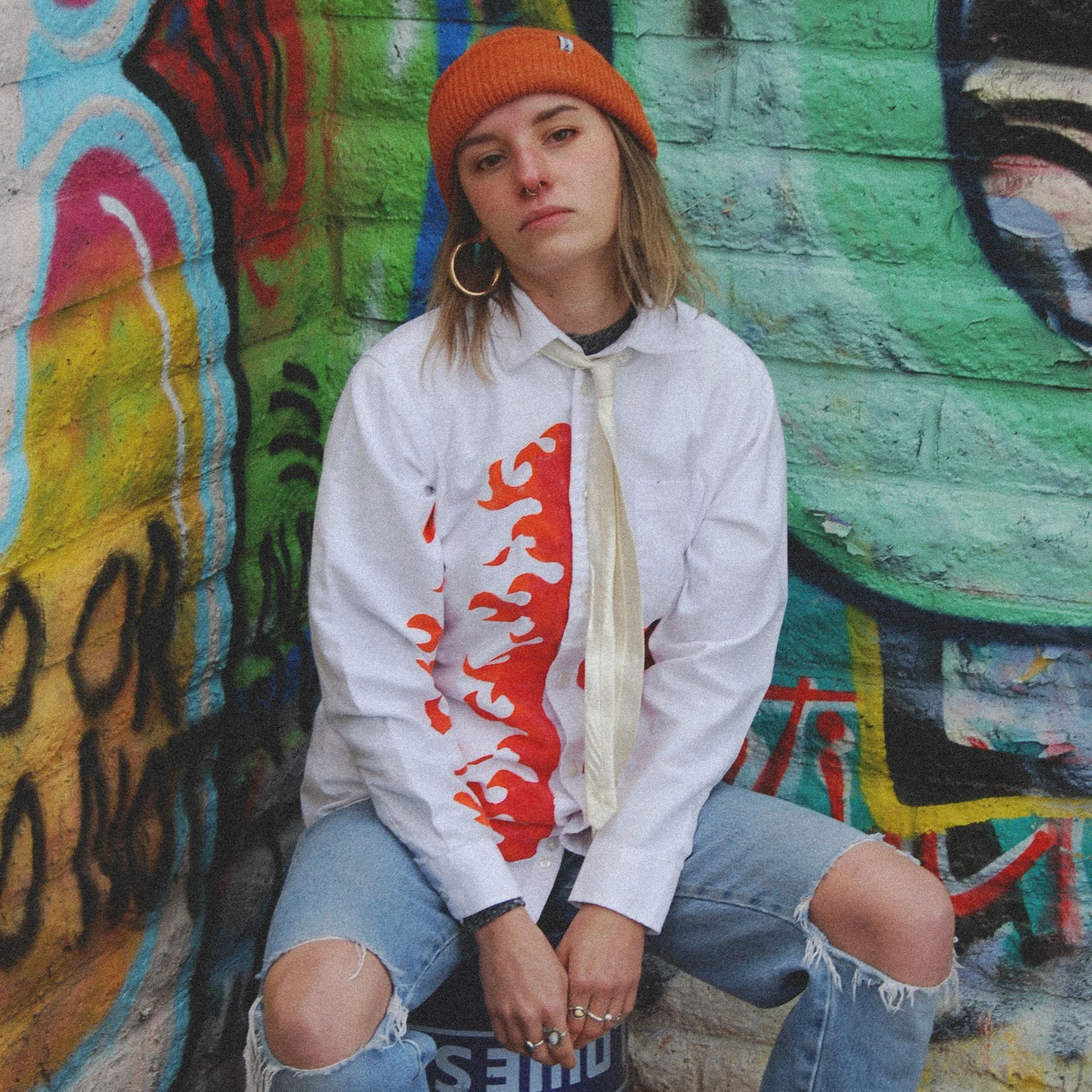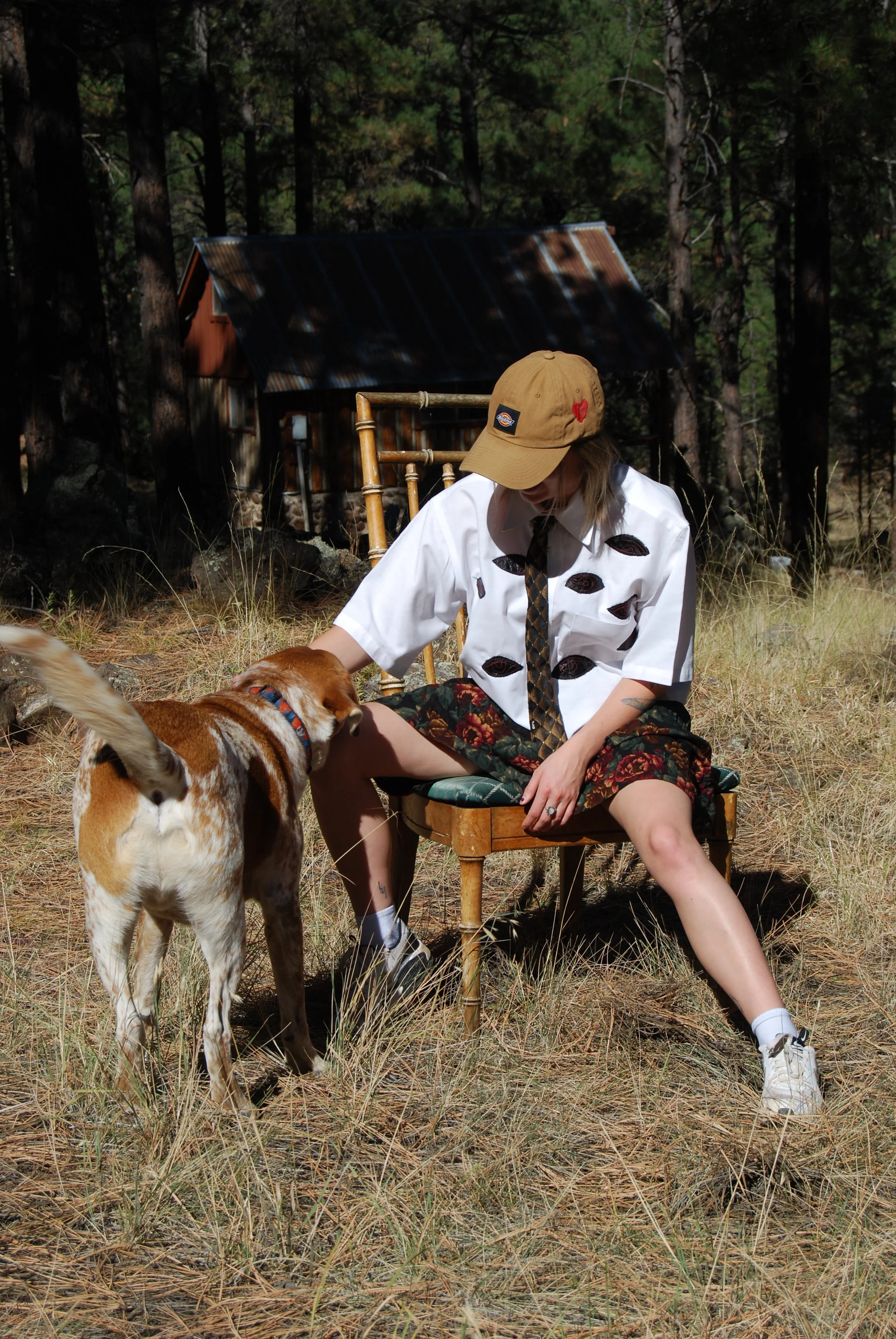 In the summer of 2024, I took the leap of moving to Flagstaff, AZ with my partner, where I have been focusing on developing an apparel brand called the Chaos Closet. This passion project evokes my love for both fashion and painting and has continued to evolve since its conception in late 2023. The ethos of the Chaos Closet aligns with a slow fashion model, where simple or damaged thrifted items can become specialty pieces with timeless styling. I see these as art pieces more than just shirts. Many of my patchwork-style collaged artworks utilize thrifted or salvaged fabrics, and I limit waste in my production by using “scrap” however possible. I’m incredibly excited to see my 2D art elevated to a usable scale.